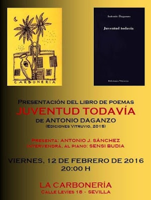 Antonio Daganzo presenta en Sevilla su último libro de poemas, JUVENTUD TODAVÍA (Edic. Vitruvio 2015). Lo hará en una de los baluartes de la cultura de Sevilla, La Carbonería. Presentado por Antonio J. Sánchez. El acompañamiento musical correrá a cargo de Sensi Budia.
