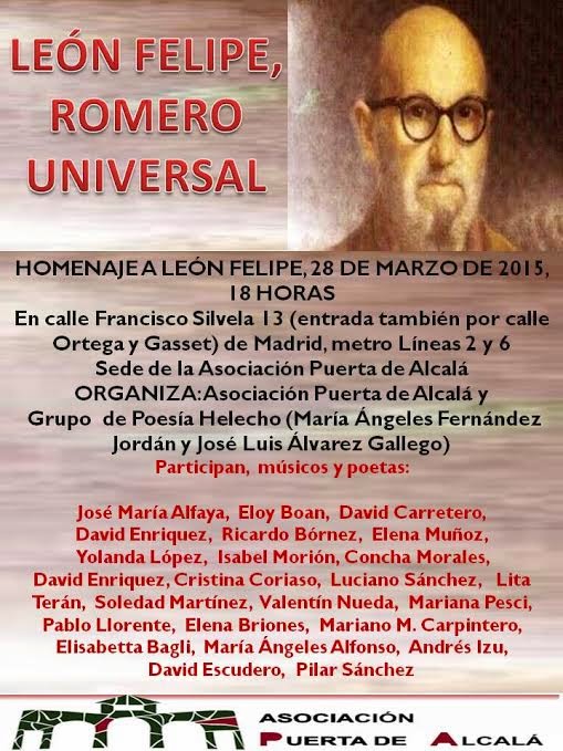 HOMENAJE A LEÓN FELIPE, 28 DE MARZO DE 2015, 18 HORAS En calle Francisco Silvela 13 (entrada también por calle Ortega y Gasset) de Madrid, metro Líneas 2 y 6 Sede de la Asociación Puerta de Alcalá ORGANIZA: Asociación Puerta de Alcalá y Grupo de Poesía Helecho (María Ángeles Fernández Jordán y José Luis Álvarez Gallego) Participan, Músicos y poetas: 1. José María Alfaya, (MÚSICO) 2. Eloy Boan, (MÚSICO Y POETA) 3. David Carretero, (MÚSICO Y POETA) 4. David Enriquez,…