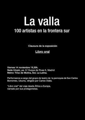 El próximo día 14 se clausurará en Utopic_Us la muestra con la Performance LIBRO ORAL a cargo del grupo de teatro de la parroquia de San Carlos Borromeo, Ubuntu, dirigido por Carlos Olalla; como veis el proyecto no puede tener un broche más emotivo, por todo ello nos gustaría enormemente contar con vuestra presencia, como así lo ha sido en todas las actividades que hemos programado.